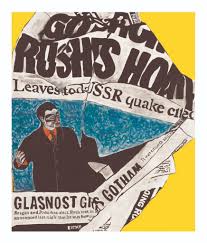 gain more offers. She searched through old magazines, posters, and newspapers to source imagery for her paintings. Her self-taught process consisted of blowing up images from magazines and newspapers, collaging them onto canvas, and then painting over them in bright, saturated colors. She also has a fondness for Elmer’s Glue in her work, saying it “doesn’t get enough credit for its role in art.”